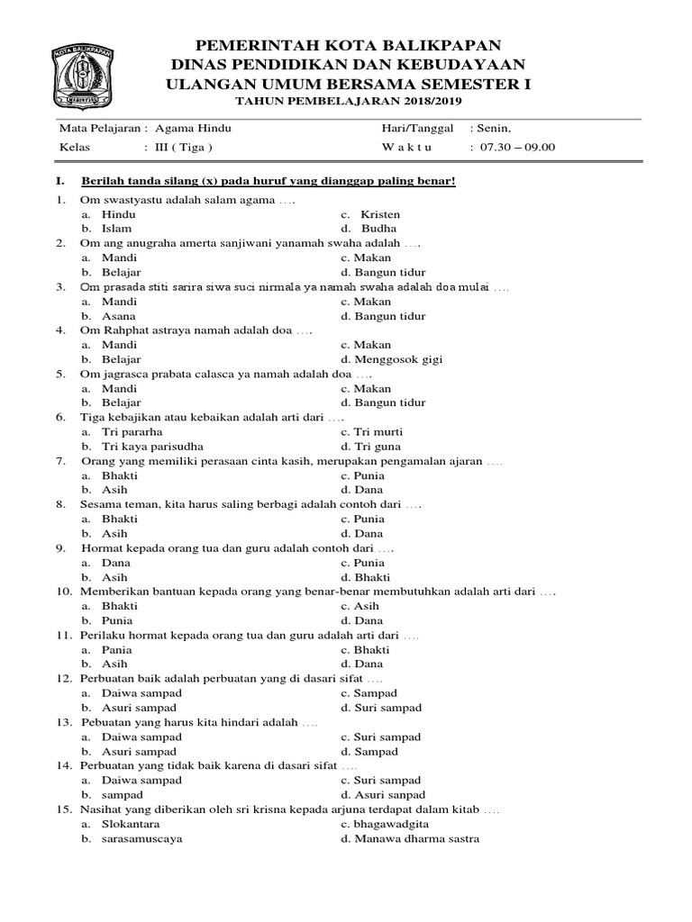 Soal Agama Hindu Kelas 3 Sd Semester 2 : Soal Agama Kelas Iii Uts Mid Semester Ii 09 10 : 2 responses to soal uas pai kelas 3 sd semester 1 ganjil dan kunci jawaban sma negeri 6 solok selatan november 7 2018 at 934 pm terimakasih untuk soal soal nya.. Web ini ini membagikan tentang soal soal ulangan, materi sekolah baik itu jenjang sd, smp, sma maupun perkuliahan, kami juga membagikan 13. Soal ulangan tengah semester 2 mata pelajaran pendidikan agama islam (pai) kelas 3 sd/ mi. Download ebook soal ulangan pai kelas 3 sd semester 2, terdiri dari soal ulhar, soal uts genap ganjil, soal uas genap, soal ukk ktsp kurikulum 2006. Download kumpulan soal uts kelas 3 semester 2 lengkap (ulangan tengah semester) untuk mengukur kemampuan kognitif siswa pada pertengahan semester kedua setiap tahunnya. 2 responses to soal uas pai kelas 3 sd semester 1 ganjil dan kunci jawaban sma negeri 6 solok selatan november 7 2018 at 934 pm terimakasih untuk soal soal nya.