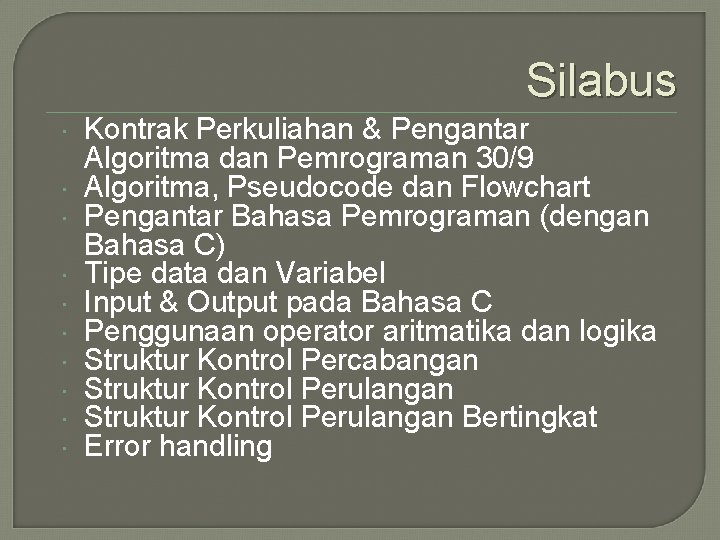Program yang disusun dengan bahasa pemrograman akan memiliki urutan dari berbagai syntax sebagai dasar dari sebuah software.